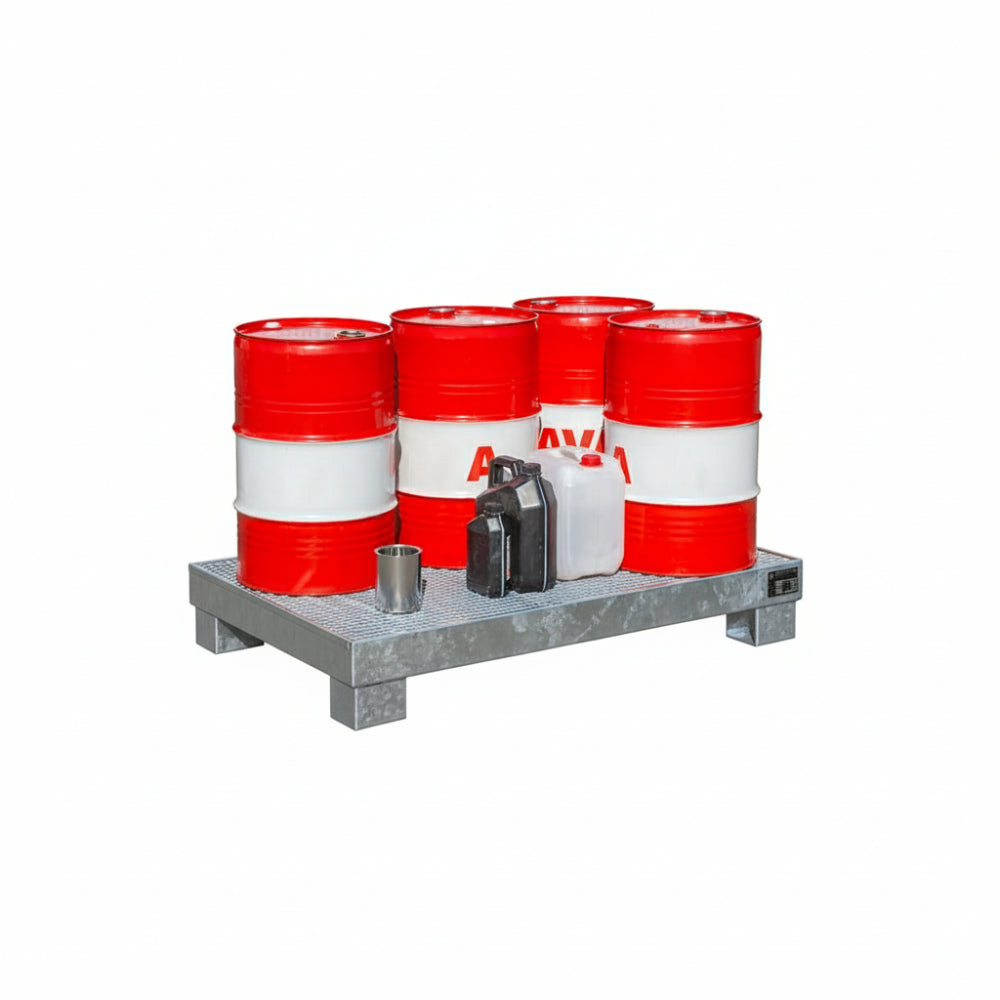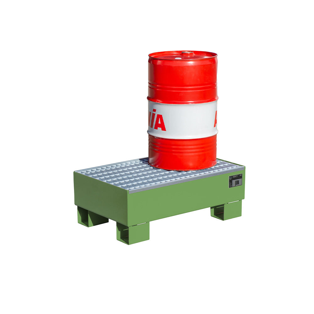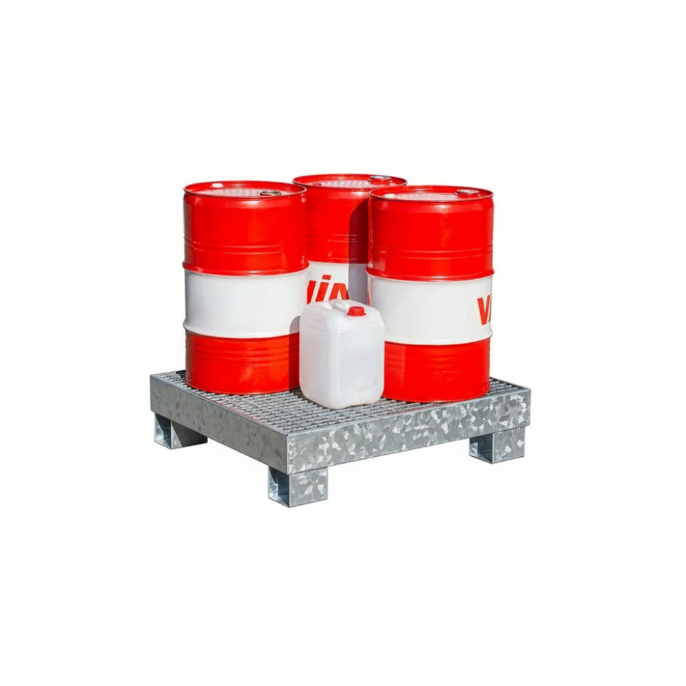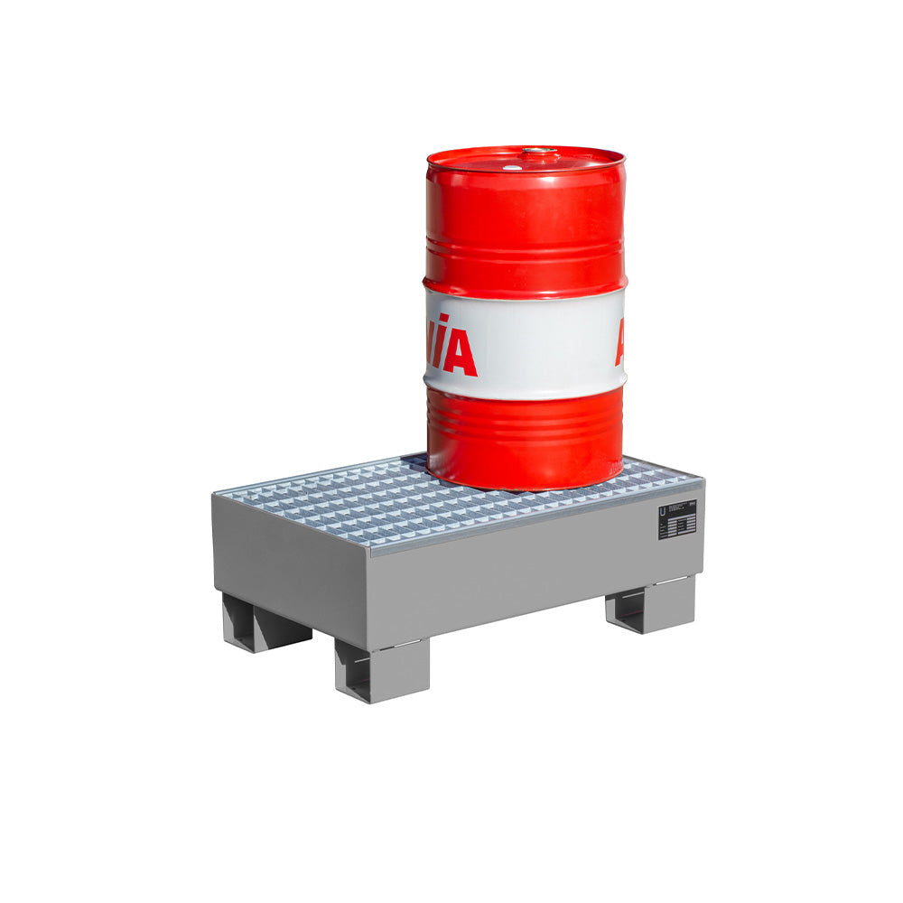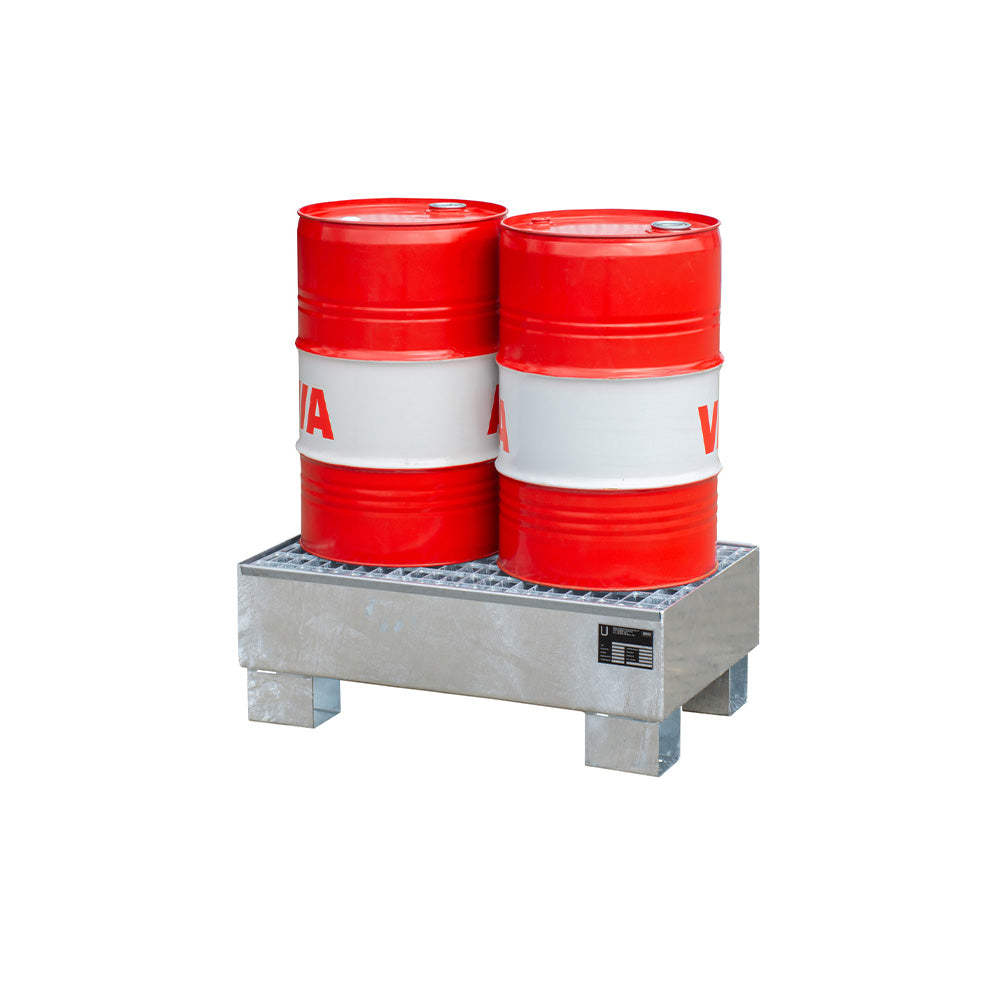 Den galvaniserade gallerinsatsen har en hög bärförmåga på 1000 kg/m², vilket ger stabilt stöd för tunga stålfat samtidigt som eventuellt spill rinner ner i karet under. .
