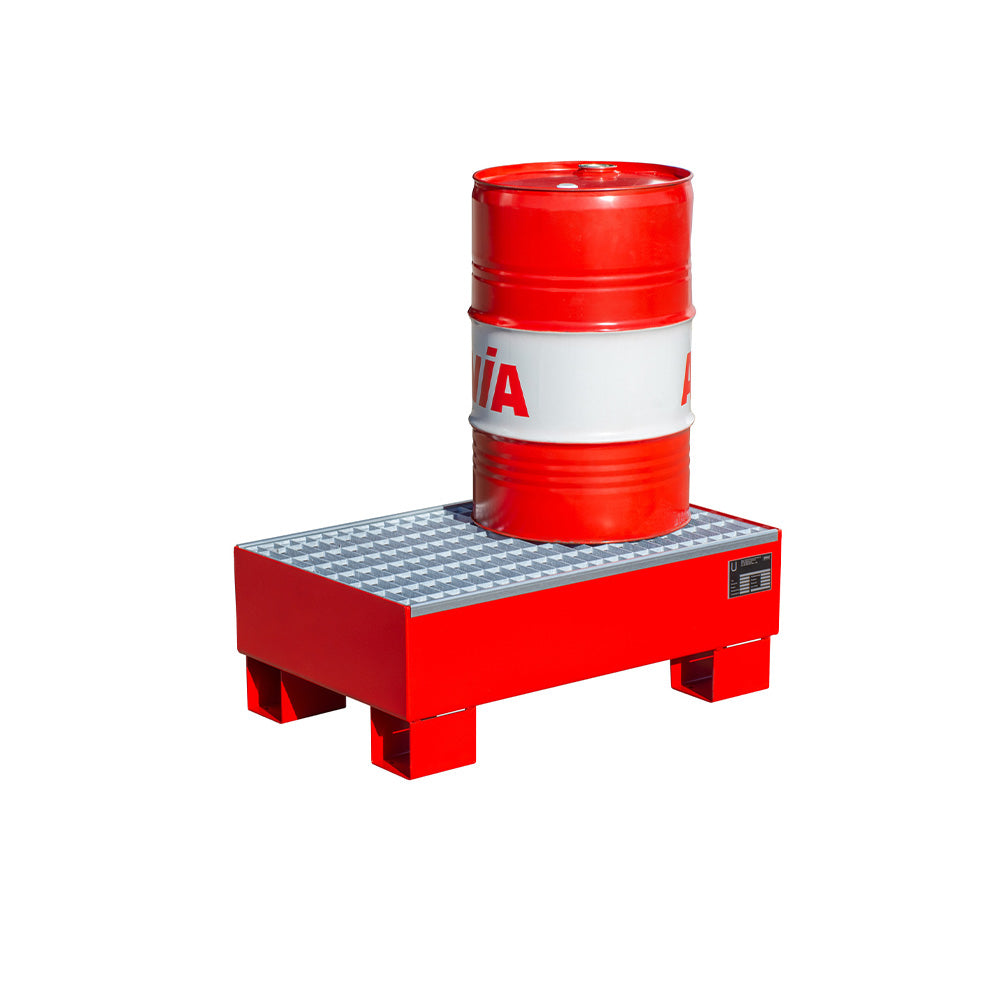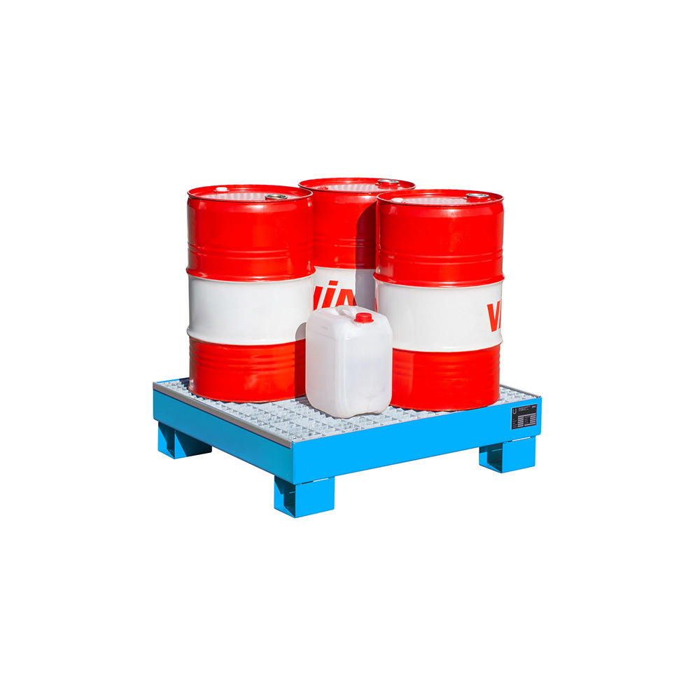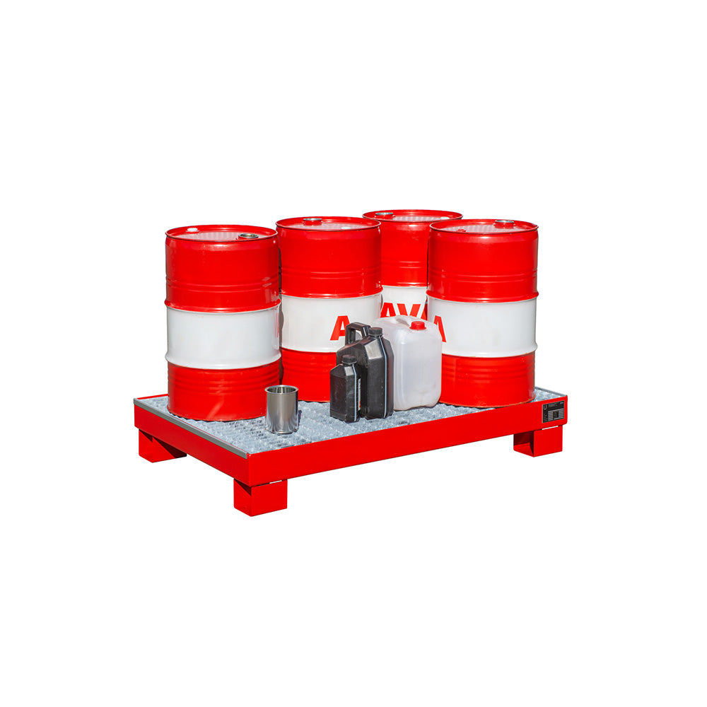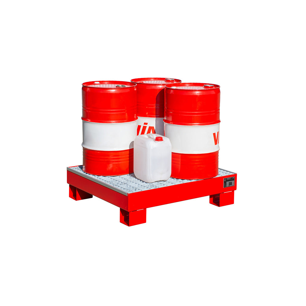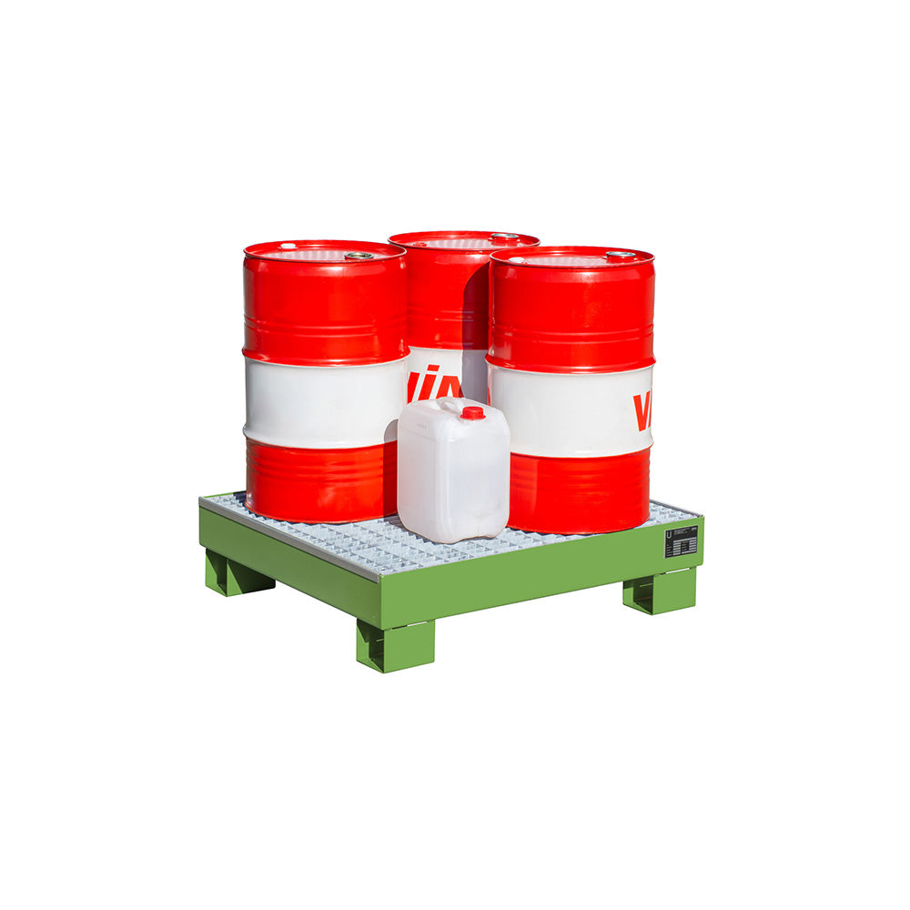 Den galvaniserade gallerinsatsen har en hög bärförmåga på 1000 kg/m², vilket ger stabilt stöd för tunga stålfat samtidigt som eventuellt spill rinner ner i karet under. .